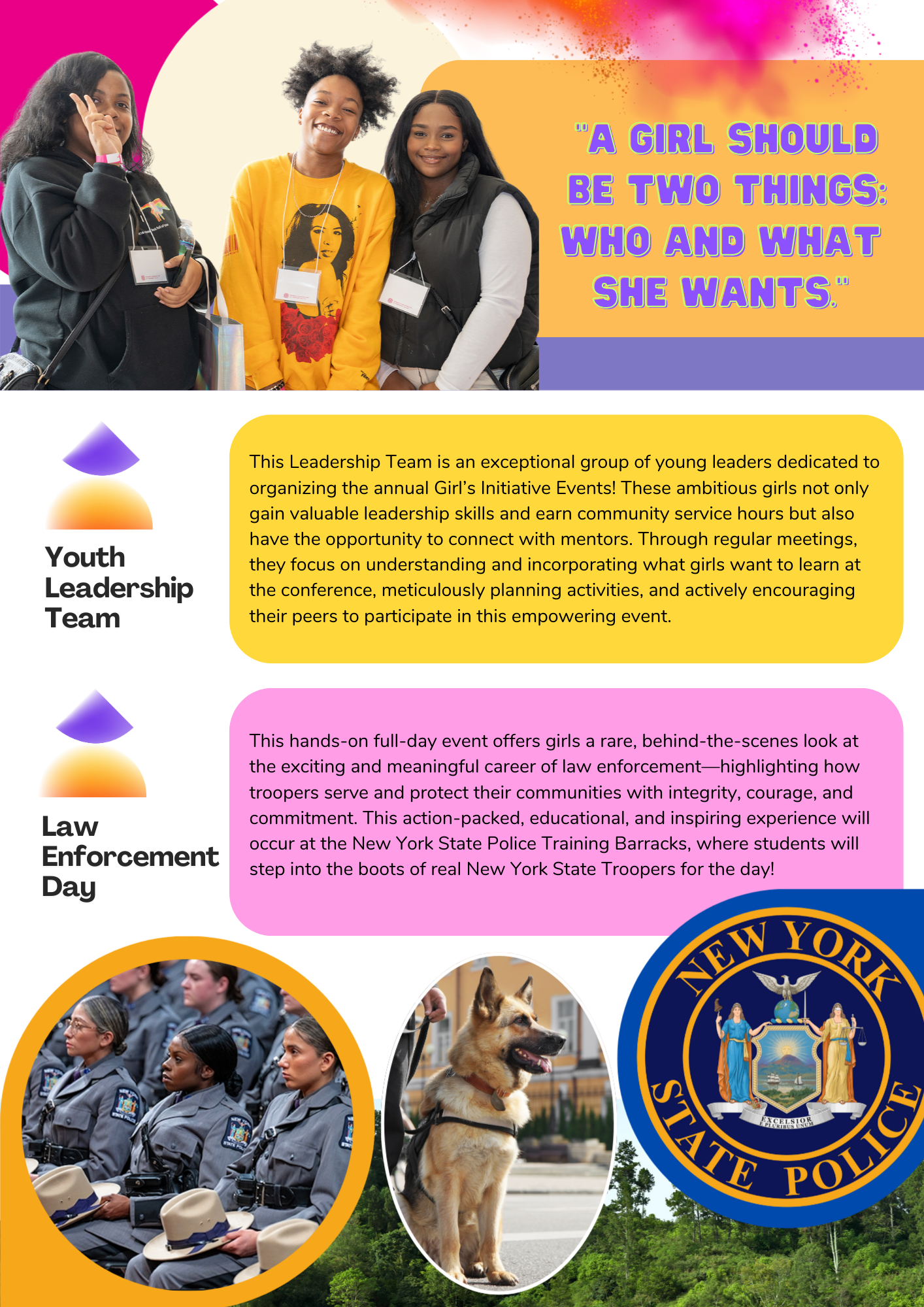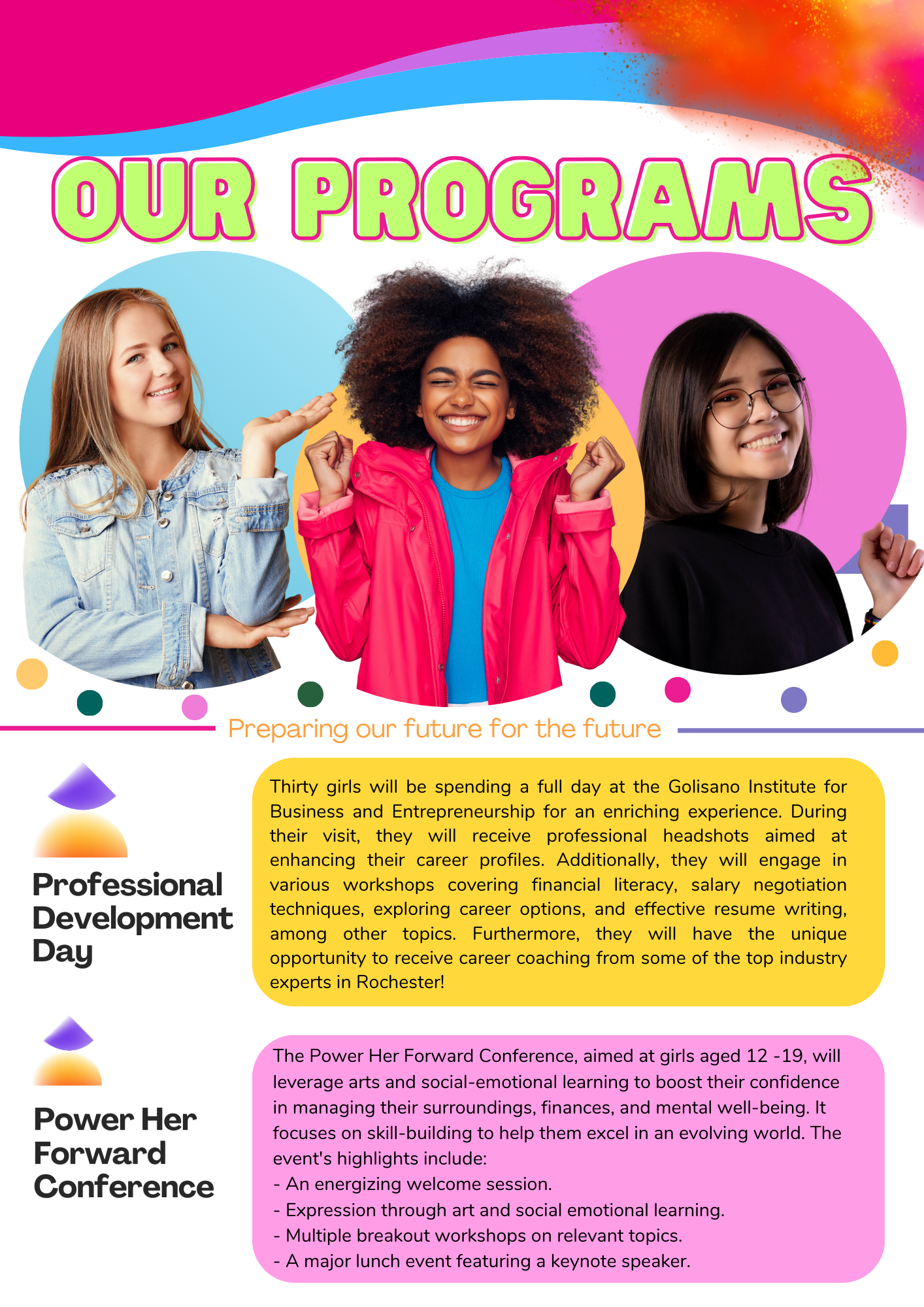 Through dynamic experiences like the Power Her Forward Girls Conference — a full-day experience featuring breakout sessions, hands-on art workshops, and inspiring speakers — and the Professional Development Day hosted at the Golisano Institute for Business and Entrepreneurship, girls gain the tools and exposure to thrive in any path they choose. Other signature opportunities, including Law Enforcement Day and the Youth Leadership Committee, focus on self-esteem, professional development, and building positive relationships that last a lifetime.